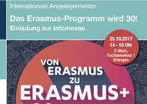 Zum 30-jährigen Jubiläum des internationalen Austauschprogramms Erasmus findet am 25. Oktober 2017 eine Informationsmesse im E-Werk statt. Hierzu die Einladung des Erasmus-Teams der FAU:
